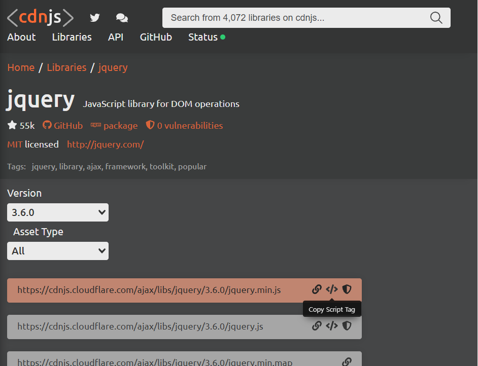 JavaScript library for DOM operations - Simple. Fast. Reliable. Content delivery at its finest. cdnjs is a free and open-source CDN service trusted by over 12.5% of all websites, serving over 200 billion requests each month, powered by Cloudflare. We make